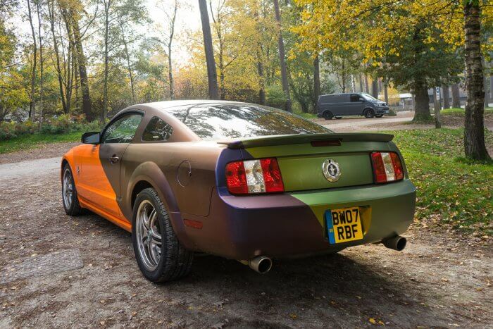 Here’s my 2007 Ford Mustang Deluxe 4.0 V6 with heated seats, a 500 shaker audio system cream leather and of course a very unique chameleon vinyl wrap and custom twin exhaust it makes this car one of a kind!